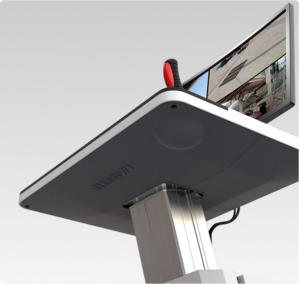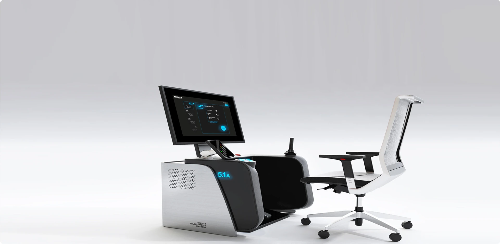 Durante el proceso innovador de diseño de producto, se definieron la arquitectura técnica, selección de materiales, análisis de inversiones y procesos de industrialización. Se incorporó una pantalla panorámica para una visión inmersiva y una segunda pantalla de apoyo para la operativa. El escritorio regulable en altura y los materiales antibacterianos y reciclables completan un diseño adaptable, seguro y sostenible.